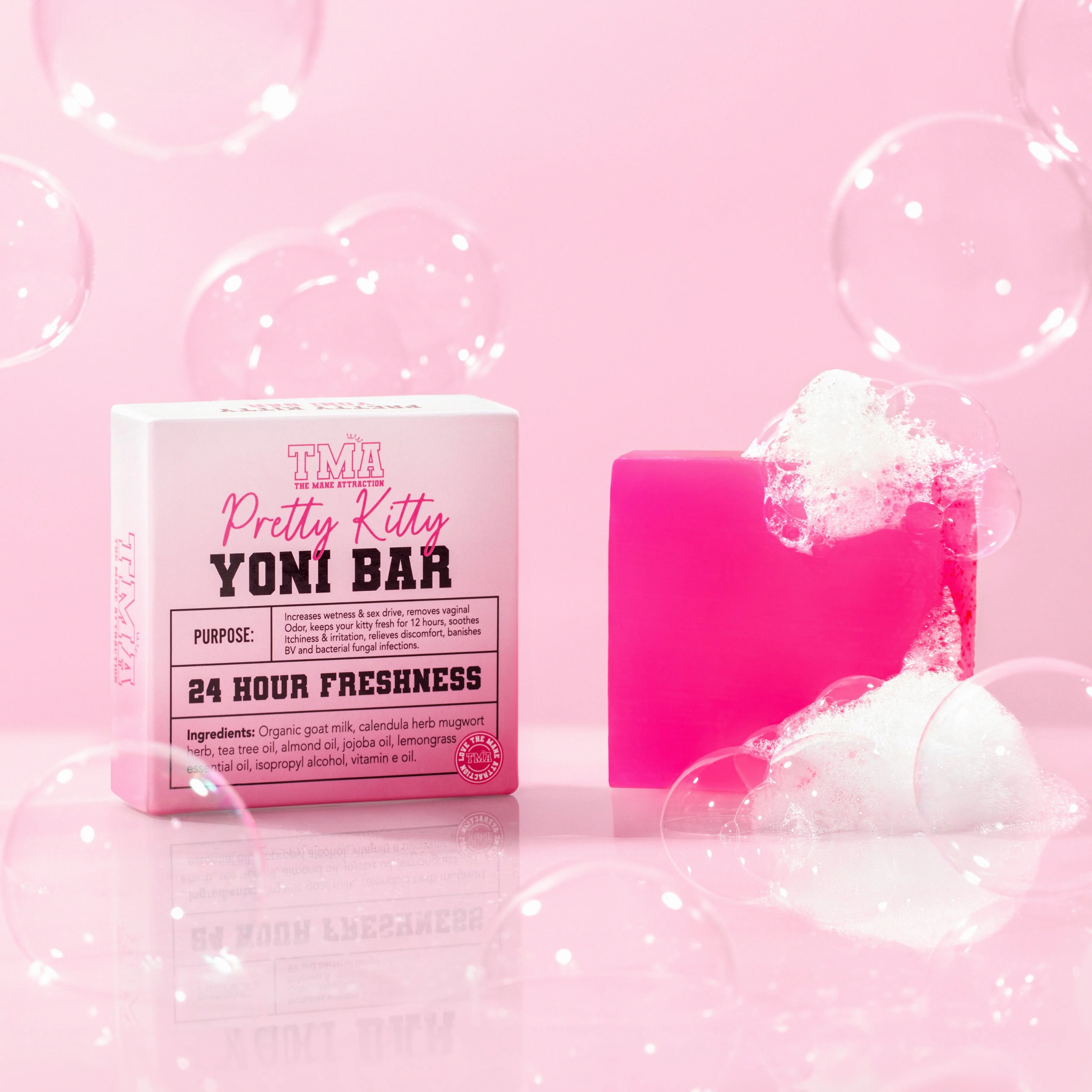 Directions: Completely saturate loofa, wash cloth, or hands with warm water and lather the yoni bar. Wash entire intimate area and anus. DO NOT INSERT INSIDE VAGINAL OPENING. This bar can also be used to cleanse the entire body. Pair with The Mane Attraction's Pretty Kitty Yoni Oil for best results.